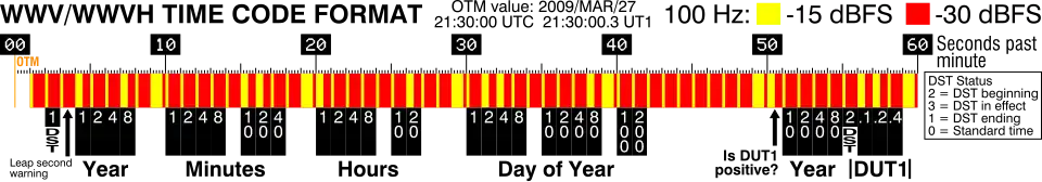 - Les tonalités audio envoyées pendant les 45 premières secondes de la plupart des minutes sont échangées : 600 Hz pendant des minutes paires et 500 Hz pendant des minutes impaires. (Recevoir les deux simultanément donne à l'auditeur un son similaire à un carillon qui sonne continuellement).