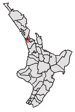 L'orange foncé montre la zone urbaine de Waitakere, le reste de l'agglomération du Grand Auckland est en gris.