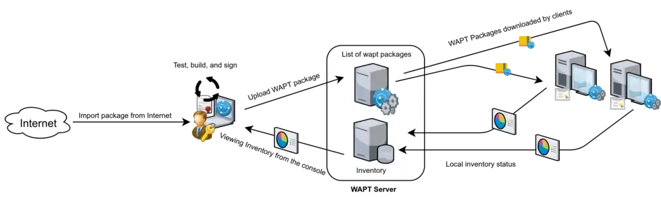 Il peut être utilisé pour installer des paquetages logiciels tels que des programmes d'installation, les mises à jour Windows, des Services Packs, des hotfix depuis un serveur central WAPT ou serveur web répliqué.
