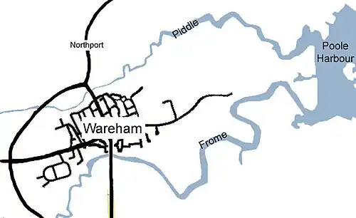 La ville est construite sur un point sec stratégique, entre le fleuve Frome et le fleuve Piddle, à l'embouchure de la baie de Poole Harbour. La Frome traverse une zone de roches de sable, d'argile et de graviers non résistantes, et une grande partie de sa vallée possède de larges plaines inondables et des marais. À son estuaire, la rivière a formé une large baie peu profonde du port de Poole.