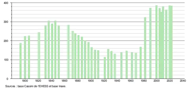 L'évolution du nombre d'habitants est connue à travers les recensements de la population effectués dans la commune depuis 1793. Pour les communes de moins de 10 000 habitants, une enquête de recensement portant sur toute la population est réalisée tous les cinq ans, les populations de référence des années intermédiaires étant quant à elles estimées par interpolation ou extrapolation[19]. Pour la commune, le premier recensement exhaustif entrant dans le cadre du nouveau dispositif a été réalisé en 2004[20].
