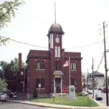 Bureau de poste de la ville de Waterloo devant lequel siège un monument commémorant les soldats morts au combat lors de la deuxième guerre mondiale.