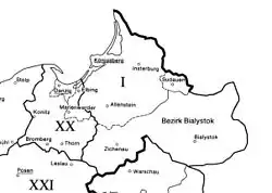 La 1re région militaire allemande comprenait le Bezirk Bialystok et deux zones d'affectation (Wehrersatzbezirk) :