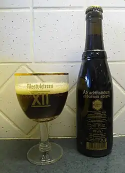 - la Trappist Westvleteren XII (capsule jaune)[4], une brune titrant 10,2 % d'alcool appelée abt (quadruple) refermentée sur un lit de levure qu'il convient d'éviter de verser.