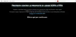 Le , Wikipédia en anglais est fermée pendant 24 heures, par décision de ses contributeurs, pour protester contre deux projets de loi examinés au Congrès américain : Stop Online Piracy Act et Protect Intellectual Property Act. Wikipédia en italien affiche alors, en lieu de sa page principale, un message de soutien à la décision de l'encyclopédie anglophone (voir image ci-contre). Ayant pris connaissance du message, le lecteur peut ensuite accéder à l'encyclopédie elle-même[16].