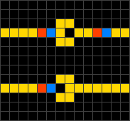 2 Des diodes Wireworld, celle d'au-dessus laisse passer le courant, celle d'en dessous bloque le courant