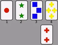 Les cartes diffèrent en fonction des formes qui y sont dessinées, de la couleur et du nombre de celles-ci.