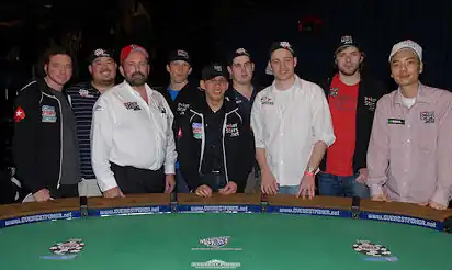 Nouveauté cette année, la table finale des WSOP 2008 se joue en novembre. Elle a eu lieu le , soit 117 jours après l'élimination du 10e. Elle était composée de neuf joueurs :