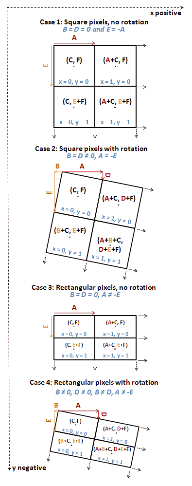 - x_{raster} = est le numéro de colonne du pixel dans l'image (raster) en comptant à partir de la gauche Coordonnée d’abscisse de l’image (numéro de colonne);