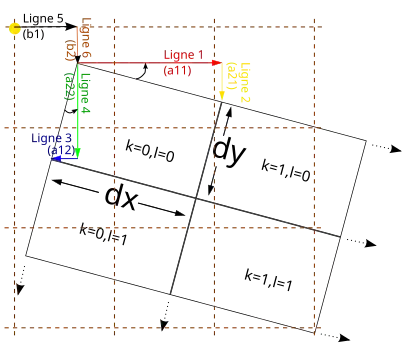 - Ligne 2: a21 = composante y de la largeur du pixel