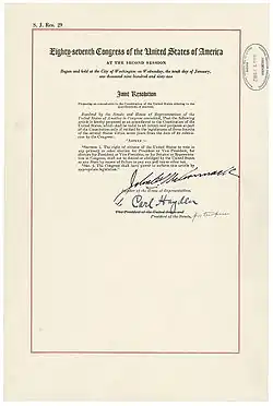 « Section 1. The right of citizens of the United States to vote in any primary or other election for President or Vice President, for electors for President or Vice President, or for Senator or Representative in Congress, shall not be denied or abridged by the United States or any State by reason of failure to pay any poll tax or other tax.