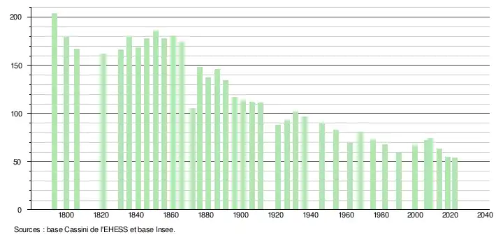 L'évolution du nombre d'habitants est connue à travers les recensements de la population effectués dans la commune depuis 1793. Pour les communes de moins de 10 000 habitants, une enquête de recensement portant sur toute la population est réalisée tous les cinq ans, les populations de référence des années intermédiaires étant quant à elles estimées par interpolation ou extrapolation[15]. Pour la commune, le premier recensement exhaustif entrant dans le cadre du nouveau dispositif a été réalisé en 2008[16].