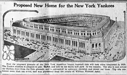 Les Yankees ont immédiatement commencé à rechercher un terrain pour construire un nouveau stade de baseball. Un emplacement de dix acres à moins de deux kilomètres du Polo Grounds dans le Bronx a été acheté pour y construire un stade. Le , l'équipe a publié un communiqué de presse pour annoncer l'achat de la propriété dans l'ouest du Bronx. Le terrain fut acheté du domaine de William Waldorf Astor pour 675 000 $ dollars. Conçu par Osborn Engineering, à l'origine le projet prévoyait un stade avec trois niveaux de tribunes entourant le terrain entier. C’était le premier stade de baseball à trois balcons; il comptait 58 000 sièges. La construction du stade a commencé le . Il a été construit principalement avec de l'acier et du béton. Le bâtiment, nommé Yankee Stadium, a été construit en seulement 284 jours. Il a ouvert ses portes le .