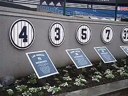 Les numéros retraités ont été affichés derrière la clôture du terrain gauche de l’ancien Yankee Stadium et devant le enclos de l’équipe adverse, formant une petite allée qui relie Monument Park aux gradins de gauche. Lorsque la franchise s'est déplacée de l'autre côté de la rue vers le nouveau stade, les chiffres ont été intégrés à Monument Park, qui occupe une place centrale sur le terrain entre les deux enclos.
