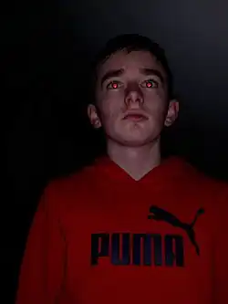 Ce phénomène s'explique par le fait que lors de la prise de vue, face à la forte lumière du flash et dans un lieu mal éclairé (la pupille de l'œil se dilatant dans le noir pour capter la lumière), l'iris n'a pas le temps de réduire la taille de la pupille. Il en résulte que le flash (plus particulièrement lorsqu'il est positionné près de l'axe de l'objectif) éclaire le fond de l'œil[1]. La rétine étant transparente, elle laisse entrevoir la choroïde qui est richement vascularisée et dont la couleur est rouge. C'est la choroïde ainsi éclairée qui renvoie cette couleur.