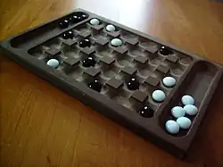 La partie se joue sur un plateau de cinq par six. Quand la partie commence, le plateau est vide et chaque joueur a douze pièces en main. Lors d'un mouvement, un joueur peut soit :