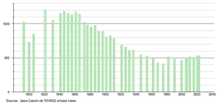 L'évolution du nombre d'habitants est connue à travers les recensements de la population effectués dans la commune depuis 1793. Pour les communes de moins de 10 000 habitants, une enquête de recensement portant sur toute la population est réalisée tous les cinq ans, les populations de référence des années intermédiaires étant quant à elles estimées par interpolation ou extrapolation[30]. Pour la commune, le premier recensement exhaustif entrant dans le cadre du nouveau dispositif a été réalisé en 2005[31].