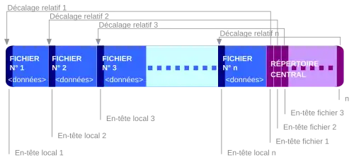 Un fichier ZIP est une archive de fichiers compressés individuellement. Cela signifie qu'il n'est pas nécessaire de décompresser toute l'archive pour extraire un fichier. La position de chaque fichier, ainsi que son nombre d'octets et d'autres informations sont disponibles dans le répertoire situé en fin de fichier. Ce format permet de supprimer et d'ajouter des fichiers de manière incrémentale, le répertoire étant décalé après les nouveaux fichiers.