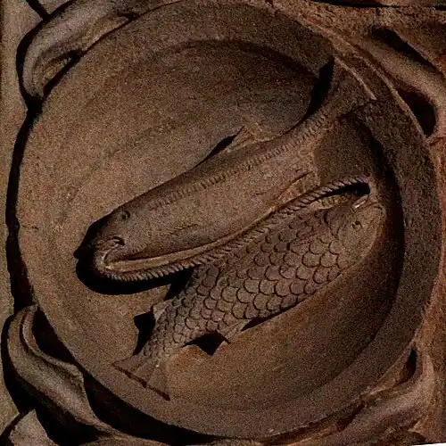 Les Poissons sont entre février et mars. Représentation traditionnelle de deux poissons tête-bêche, reliés par une corde. Dans la symbolique chrétienne, les deux poissons représentent l'ancien et le nouveau testament.