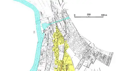 Extrait du schéma de zonage assainissement de Chalifert (77). En jaune les zones relevant de l'assainissement collectif, en blanc les zones relevant de l'assainissement individuel, en bleu les cours d'eau