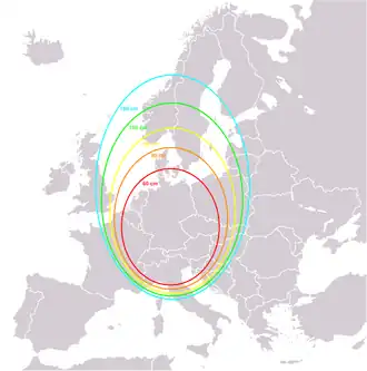 Ensuite, au fur et à mesure que l'on s'éloigne du faisceau comportant un contour central à 50 dBw, en perdant 1 dBw, on rajoute 12,25 % au diamètre précédent, pour (re)gagner 1 dB, ainsi de suite...