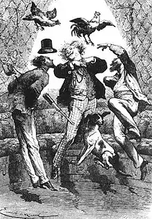 - Michel Ardan jouant aux dominos avec Barbicane et Nicholls dans l'obus qui, de retour sur Terre, flotte à la surface de l'océan.