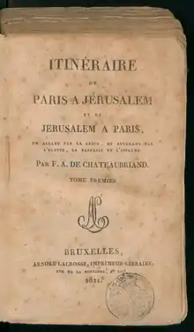 - Itinéraire de Paris à Jérusalem (1861), François-René de Chateaubriand, éd. Garnier, coll. « ŒUVRES COMPLÈTES », 1861, chap. VII « Voyage de Tunis et retour en France », t.II Itinéraire de Paris à Jérusalem, p. 422
