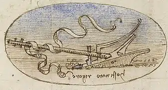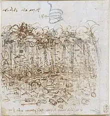 Léonard a écrit ce que l'on considère comme son premier « morceau » de littérature autonome, puisque sans dessins, c'est-à-dire le texte sur le monstre marin et la caverne (Codex Atlanticus, fol. 715 r°-v°; Codex Arundel, fol. 155 r°-v°), datable vers 1478-1480. Dans ce texte, qu'il n'a cessé de reprendre et de corriger en quête d'une image fabuleuse, il s'est efforcé de décrire avec des mots une vision née de sa seule imagination et donc étrangère à la réalité et à l'observation directe. Italo Calvino a dit de cet effort littéraire qu'il était « un combat avec la langue », impliquant certainement une création « à la table de travail », loin de l'observation scientifique poursuivie trente ans plus tard, et une mise à l'écart momentanée du dessin. Et s'il ne fait aucun doute que ce combat a été, à de rares exception près, voué à l'échec, alors qu'avec le dessin Léonard a toujours été victorieux, ne peut-on avancer que, pour lui, le dessin adhère à la réalité des choses, tandis que l'écriture a pour tâche de décrire une image mentale ?