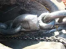 - Accessoire métallique équipé d’un axe permettant de joindre deux cordes tout en laissant libre un mouvement de rotation.
