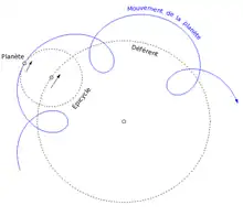 — (Antoine Furetière, Dictionnaire universel, contenant generalement tous les mots françois, Volume 4, 1727)La planète décrit un cercle dit épicycle, dont le centre se déplace sur un cercle appelé déférent dont le centre est la Terre.