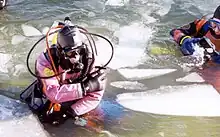 Plongeurs sous-marins vêtus d’une combinaison étanche.