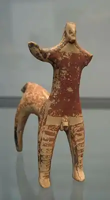 - Dérivé de κεντέω, kentéō (« piquer »)[1], soit par le langage de la tauromachie (notre picador moderne), soit par celui de l’élevage, et synonyme de κέντωρ, kéntōr (« piqueur »). La seconde partie du mot ayant été rapprochée de ταῦρος, taûros (« taureau ») d’où la dérivation mythologique de « animal mi-homme mi-taureau ». Étant donné les composés ἱπποκένταυρος (« piqueur de/à cheval », plus tard, « mi-homme, mi-cheval ») et ἰχθυοκένταυρος (« pêcheur au harpon », plus tard « mi-homme, mi-poisson »), mots où ταῦρος n’a rien à faire, on rejettera cette composition fantaisiste et mythologique.