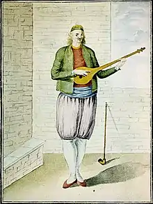 μουσικός που φοράει βράκα και παίζει ταμπουρά
