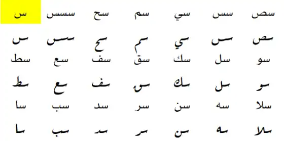 س (s) /s/ ; isolée س, initiale سلل, médiane لسل, finale للس
