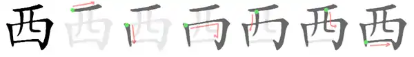 - Dans les composés : 西 peut être la déformation du caractère 襾 (bouchon, couverture, toit).