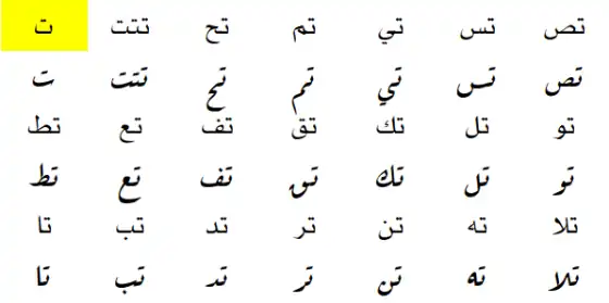 - Forme sans diacritique et isolée de تَ (ta) : (j'en jure) par...
