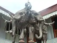 - Tiercé en pairle abaissé, au 1 d’or à l’Airavata (Erawan en thaï) de front d’argent, au 2 de gueules à un éléphant aussi d’argent et caparaçonné d’or soutenu d’une terrasse du même (Lan Xang), au 3 à deux kriss d’argent, garni d’or, posés pointe vers la pointe et passés en sautoir, celui de senestre rangé dans son fourreau d’or (qui est de Malaisie), qui est du Royaume du Siam de 1873 à 1910 → voir illustration « armoiries avec Airavata »