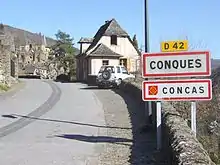 Signalisation bilingue français-occitan à l’entrée de Conques / Concas.