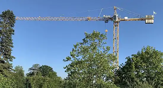 Une grue Potain MD 125 B. La flèche et son chemin de roulement sont à gauche. La contre-flèche et ses contrepoids à droite.