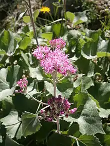 - (Botanique) Plante herbacée vivace d’éboulis en montagne, à feuilles duveteuses, et aux capitules roses. Son appellation binomiale est Adenostyles leucophylla
