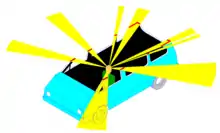 Les angles morts dans une voiture : en jaune, les zones que la personne qui conduit ne peut pas voir directement à cause de la carrosserie. (2)