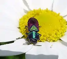 — (Anthaxia (Haplanthaxia) scutellaris, l'Anthaxie écussonnée, bolg Photo Nature Lilliputienne, roggin2.blogspot.com, 5 août 2013)L’Anthaxie écussonnée se restaure sur les marguerites, mais aussi les renoncules et les composées à fleurs jaunes, les églantines.