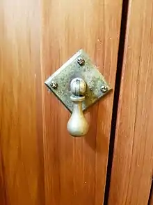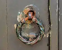 - (Serrurerie)(Rare) Sorte de poignée pendante parfois en forme de boucle, ou d’anneau. Elle commande généralement le mécanisme d’une crémone ou d'une serrure, elle peut aussi servir pour tirer un volet, un portail, une porte.