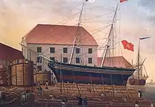 Peinture de 1837: Ber en bois supportant un brick récemment construit.