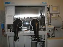 - (Biologie, Cycle du combustible nucléaire) Enceinte étanche et transparente qui est équipée de gants intégrés permettant la manipulation, sous atmosphère contrôlée, de substances nécessitant un confinement.