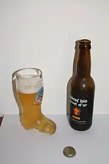 Une botte d’une contenance de 25 centilitres avec une bouteille de bière de 33 centilitres et sa capsule.
