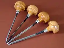 - (Héraldique) Meuble représentant l’outil de sculpteur du même nom dans les armoiries. À rapprocher de ciseau à bois et ciseau de sculpteur.