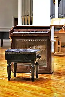 - (Musique) Instrument de musique de la famille des percussions, muni d’un clavier dont les touches actionnent des marteaux qui vont frapper des lames métalliques.