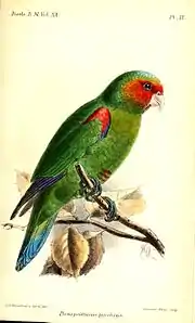 - (Ornithologie) Perruche du genre Hapalopsittaca, au plumage vert avec un masque facial et des épaules rouges, une calotte jaune, vivant dans les forêts andines de l’Équateur et du Pérou.