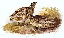 - (Ornithologie) Espèce d’oiseau gallinacé, petit gibier, une caille de l’Ancien Monde, brun-strié avec un bandeau blanc sur l'oeil.
